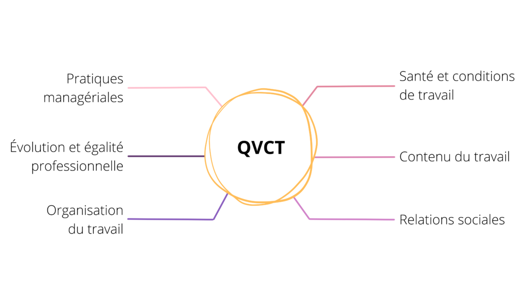 La QVCT ne se résume pas aux afterworks ou à la mise en place de babyfoots et machines à café. La QVCT est bien plus large et s’attaque tant à l’organisation du travail (structure organisationnelle, style managérial, etc.), au contenu du travail (complexité des tâches, répétitivité, etc.), aux conditions de travail (horaires, possibilités d’apprentissage, etc.), aux conditions de vie au travail (équipements, éclairage, etc.), qu’aux relations interpersonnelles (collègues, clients, fournisseurs, etc.).